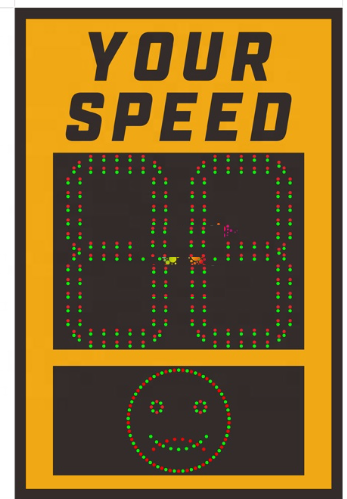 Speed value: Default setting: 40 km/h, when speed is over 40km/hr, LEDs turn red, when the speed is less than 40 km/h, LEDs turn green (with remote to change speed value). SMILEY FACE IN GREEN IF SPEED IS UNDER THE LIMIT, SAD FACE IN RED IF SPEED IS OVER THE LIMIT.